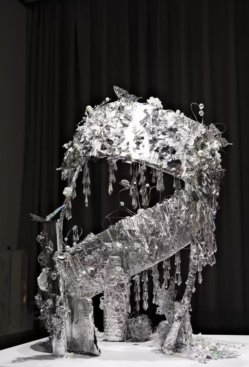 在教学成果展上,50余件匠心独运的立体造型作品共同构筑了一个名为“立体构成实验室”的展区。其中,亮点作品《古今苗韵》、《蜃楼解域》、《巴别塔》、《空中楼阁之梦》以及《苗饰银芒缀梦》尤为引人注目。