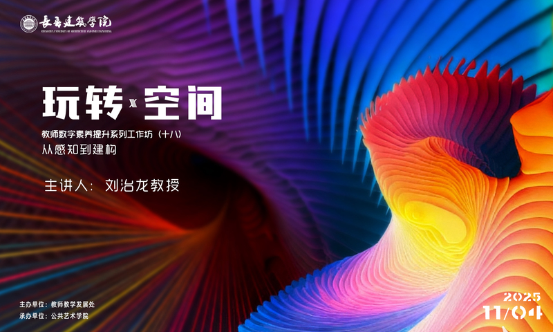 2025年11月4日,由教师教学发展处主办、公共艺术学院承办的教师数字素养提升系列工作坊(十八)在公共艺术学院国际会议中心如期举行。本次活动特邀东北师范大学教授、博士生导师、美术学院副院长刘治龙教授担任主讲嘉宾,带来题为《玩转空间——从感知到建构》的精彩报告。公共艺术学院环境设计教研室主任于丽娜担任主持,300余名师生现场聆听,座无虚席,气氛热烈。